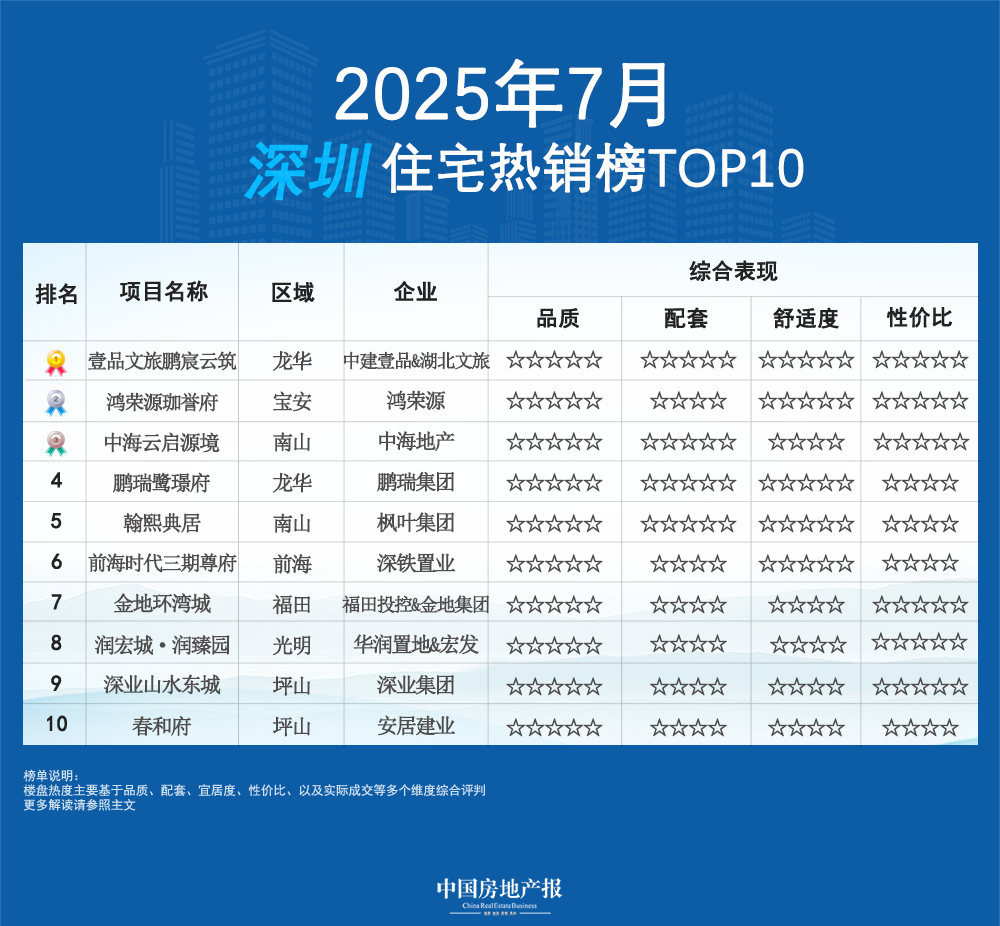 正是因此,中国房地产报大湾区持续深入深圳楼市,了解深圳房地产市场企稳回升行情,以及“好房子建设”于各企业、各项目的落地情况,并基于成交热度、产品表现、客户口碑等多维度评判及实地走访,中国房地产报大湾区推出7月深圳最值得关注的住宅热度TOP10榜单,供各位读者做置业参考。